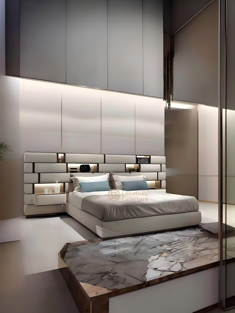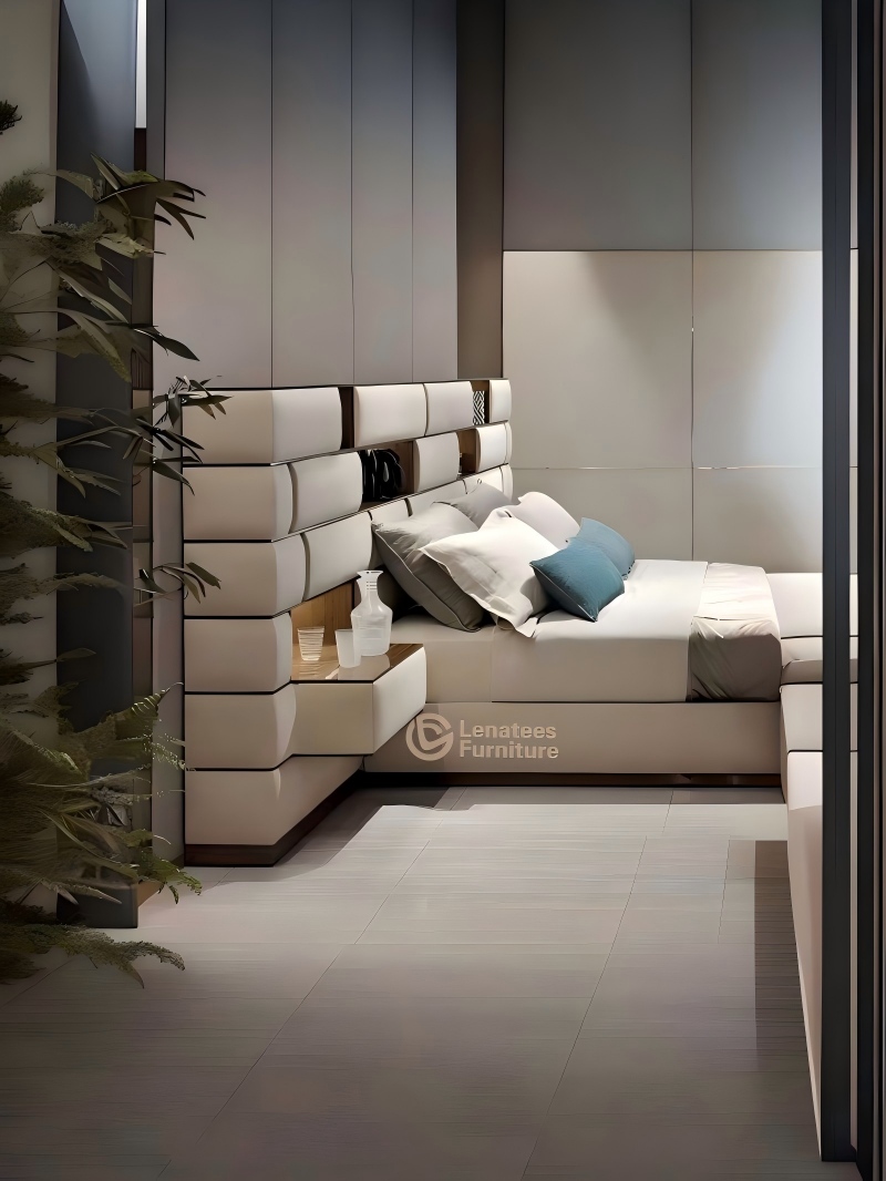 この高級ベッドは、洗練された金属のアクセントが付いた大胆なヘッドボードが特徴で、快適さ、職人技、現代的なデザインが融合しています。